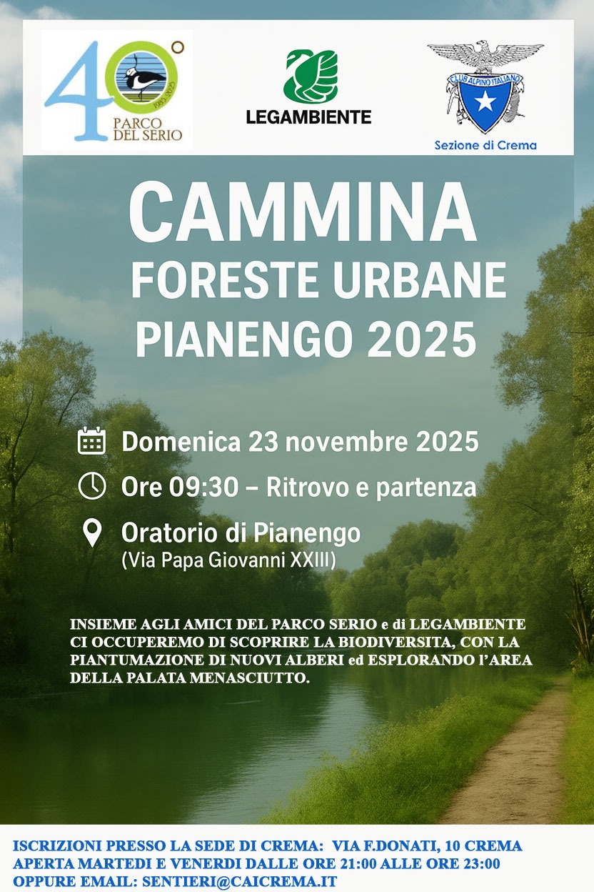 Il Parco del Serio, in collaborazione con Legambiente Lombardia, il Cai di Crema e la società Etifor organizza un’escursione nell’ambito di “Cammina foreste urbane 2025” con ritrovo a Pianengo e rientro sempre a Pianengo percorrendo un anello pianeggiante di circa 4 chilometri che attraverserà boschi, pratie zone umide delle bellissima Riserva Naturale e ZSC Zona Speciale di Conservazione della “Palata Menasciutto”